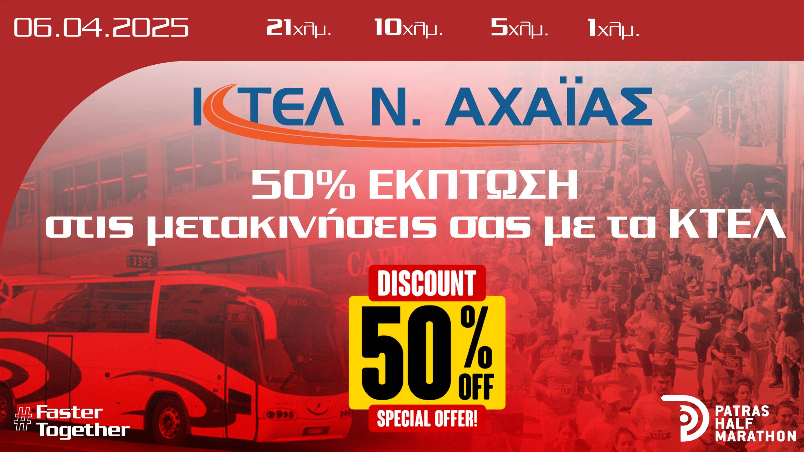 - να προμηθευτούν το εισιτήριο του ΚΤΕΛ με 50% έκπτωση (στην ηλεκτρονική κράτηση πρέπει να σημειωθεί PATRAS HALF MARATHON 2025 στο πεδίο του αριθμού της εκπτωτικής κάρτας).